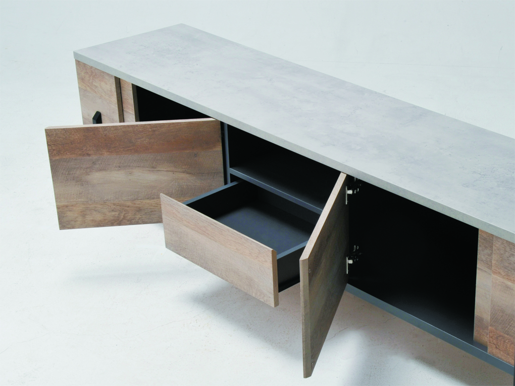 引き出し:繊維板、化粧紙貼り(天板:セメント柄(紙)、前板・側板:古木柄(立体紙))中央部引き出し内寸:W375×D285×H70㎜、